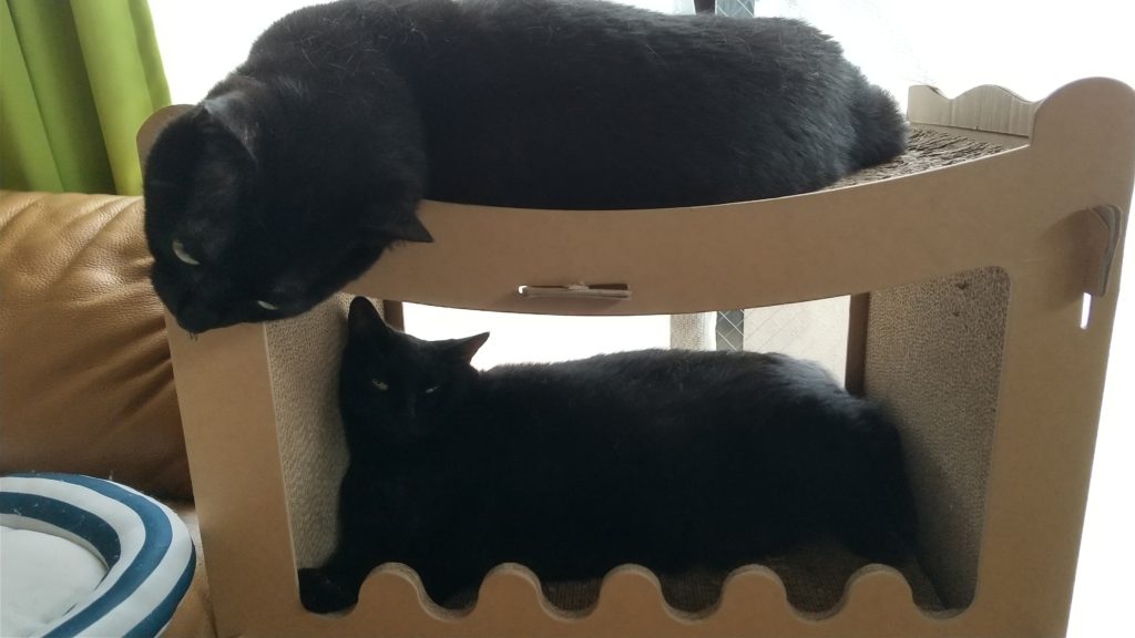 お昼過ぎにエアコン点けると今日の昼寝の場所は爪とぎ猫ハウス!