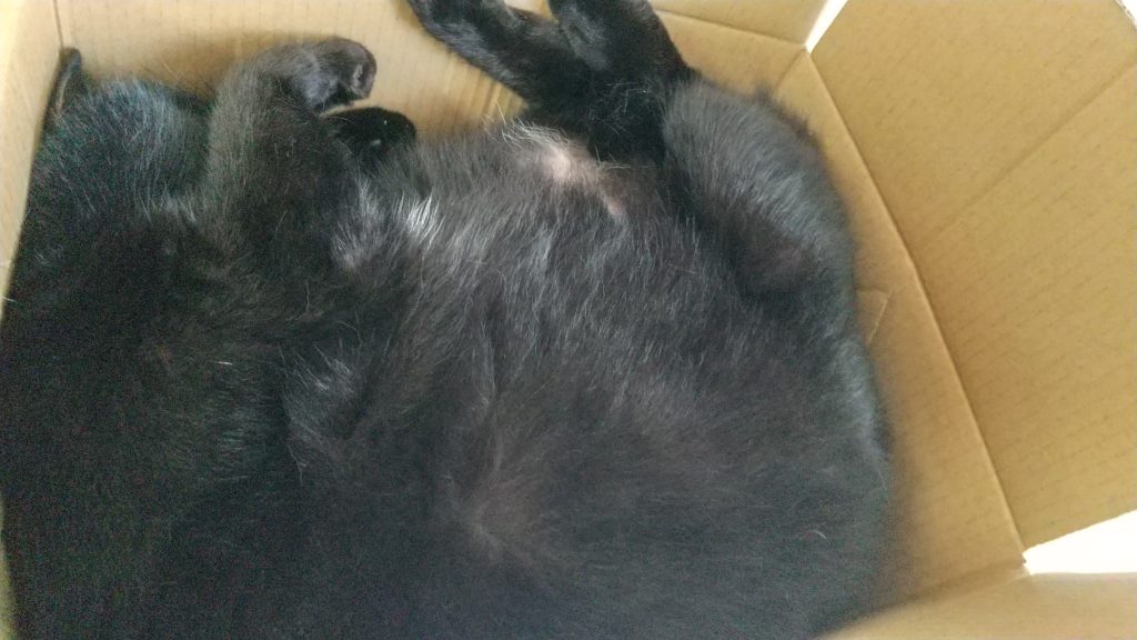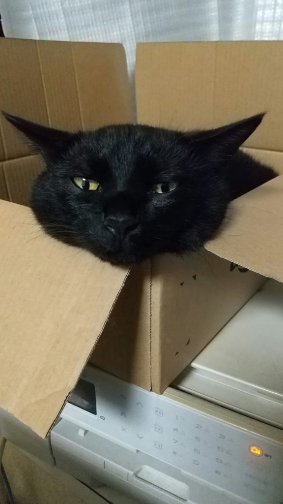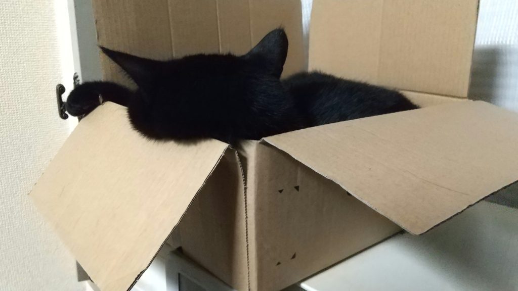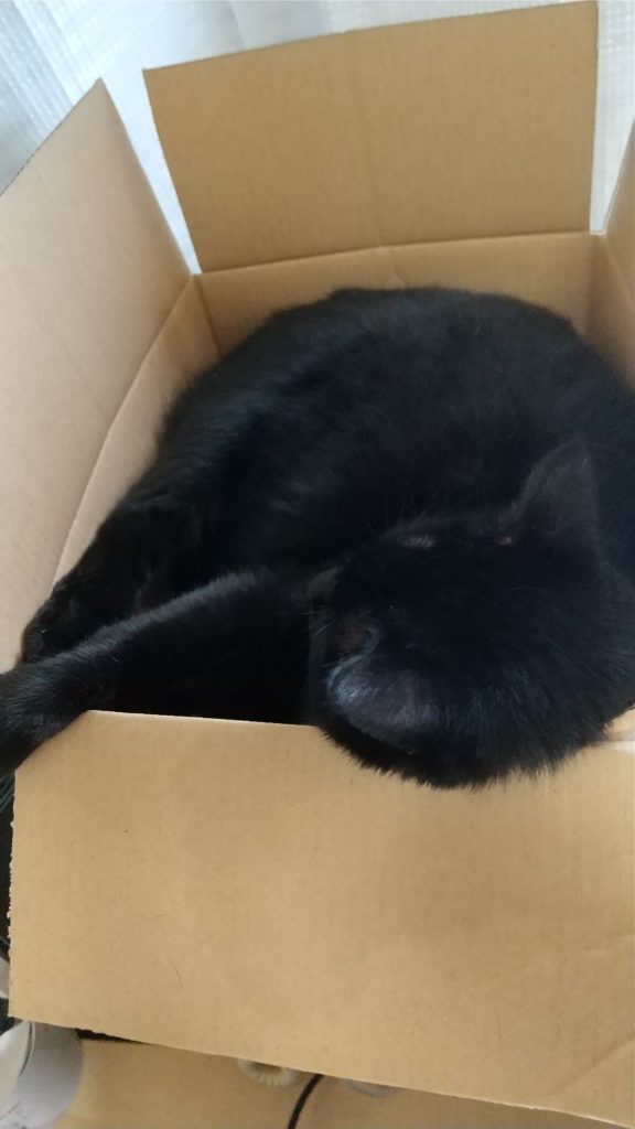 電動魚は興味ない様子だけど、電動魚が入っていたアマゾンの段ボールは大好きらしい。
