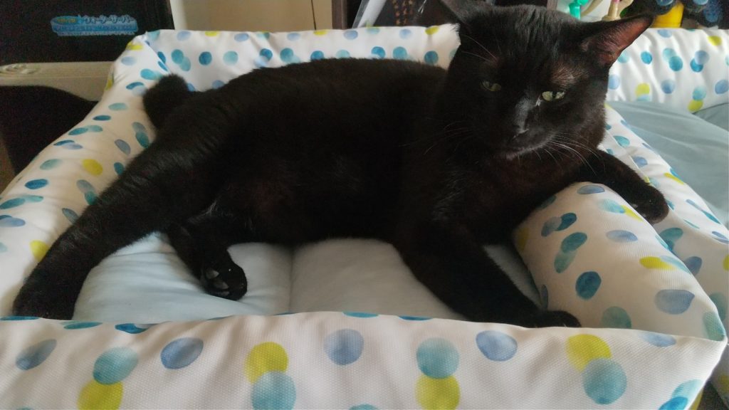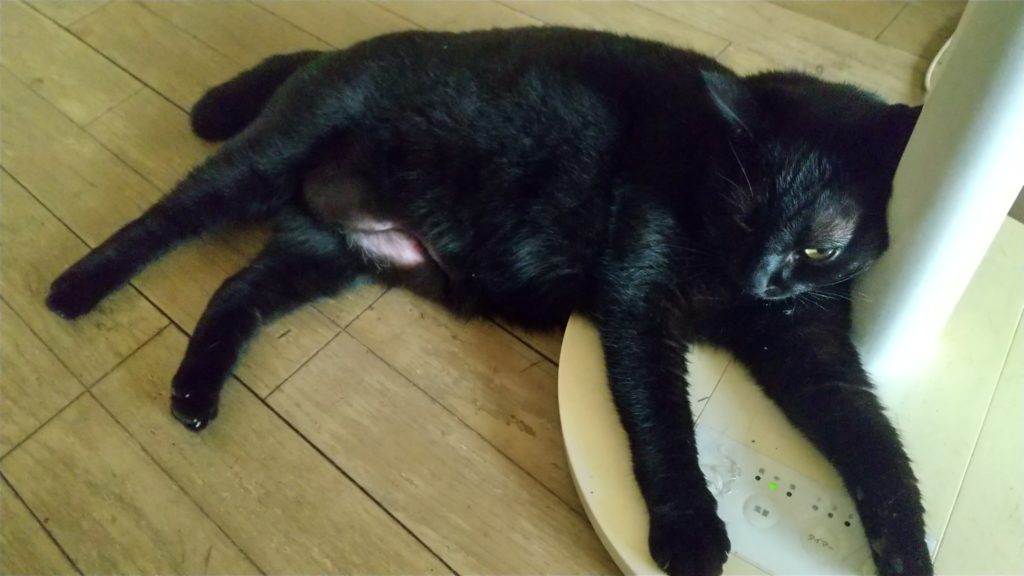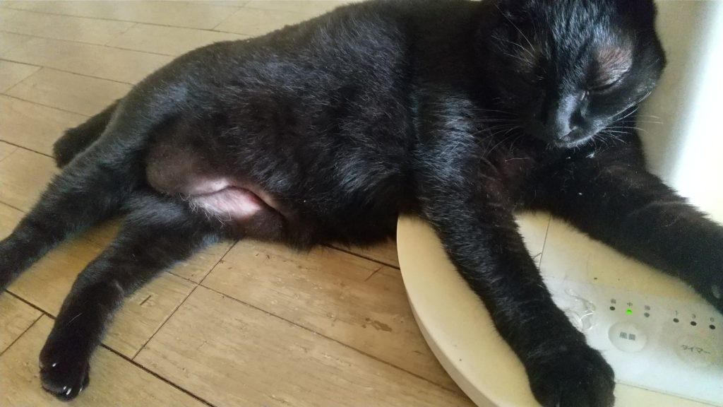 扇風機に頭をもたれて寝るアラレ。今の所ダイエット効果なしのお腹。