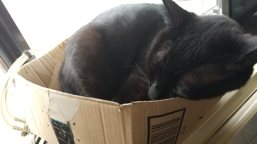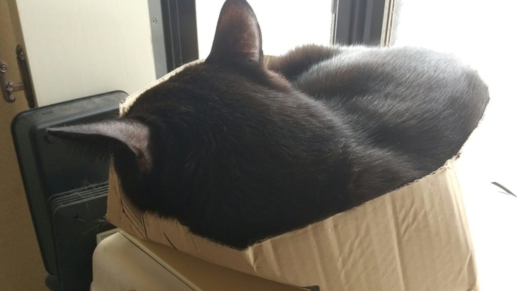 まだまだ壊れずに頑張ってるAmzonの箱で寝るオカキ。