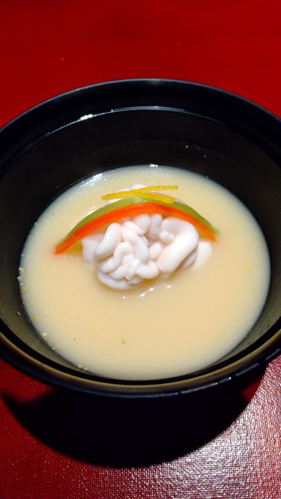 白味噌仕立 雲子 海老芋 三色野菜 松葉柚子