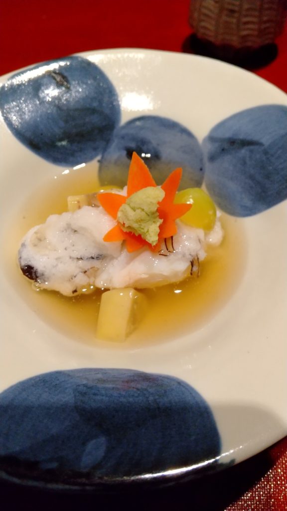 銀あんかけ 山葵。葉の形の人参が何ともよい感じ。