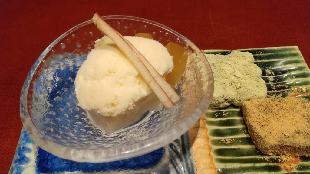 林檎づくしのデザート 二色わらびもち お薄