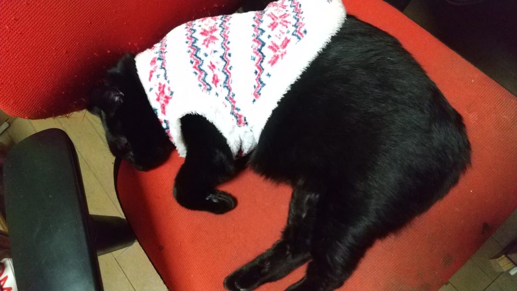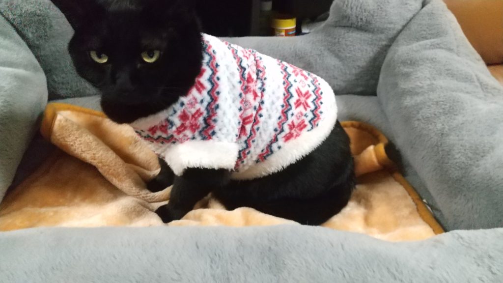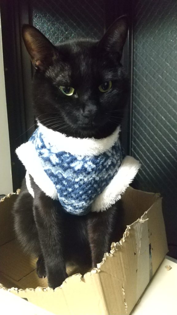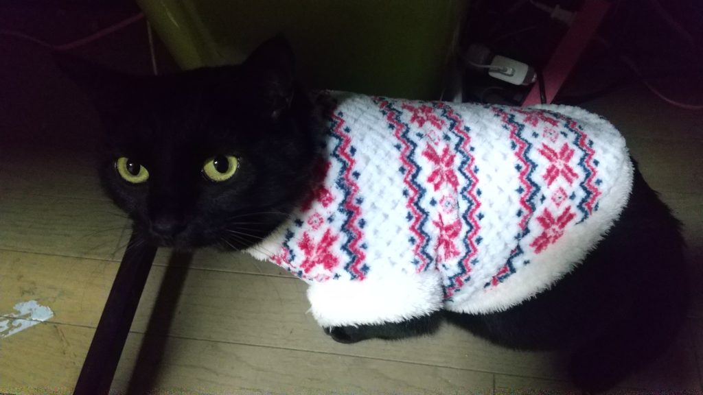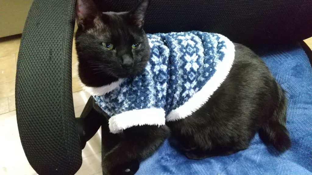 さて、黒猫共は受け入れてくれるかなと不安と期待半々で着せてみた。