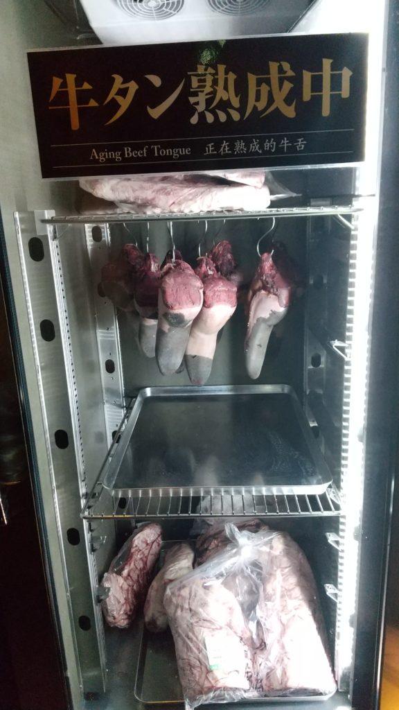 お店の入口部分には牛舌がぶらさがった冷蔵庫が!