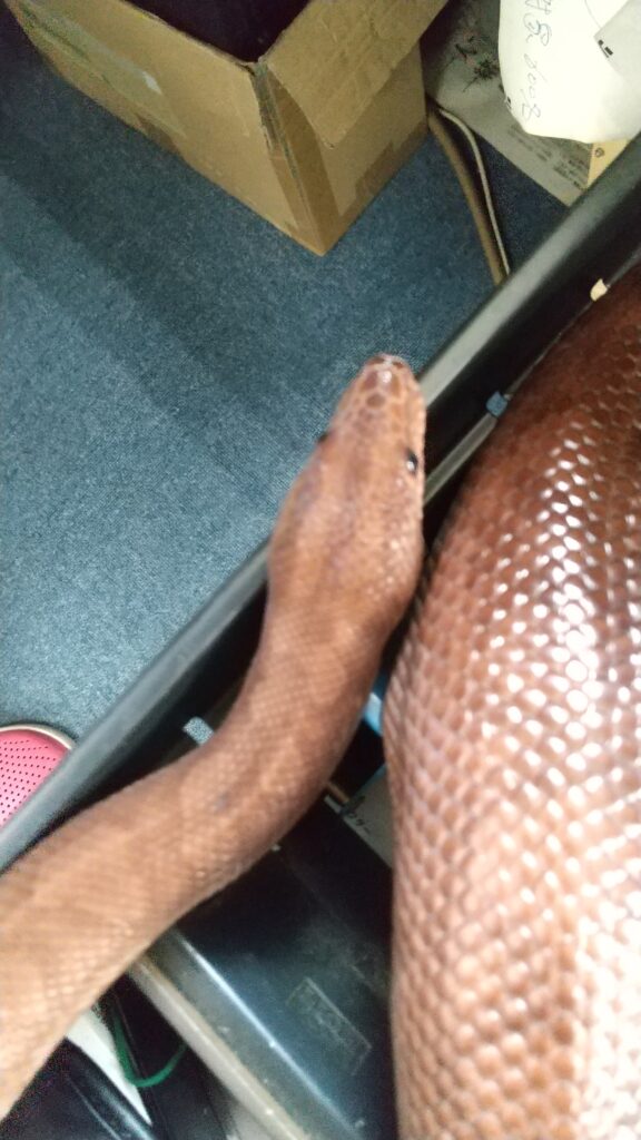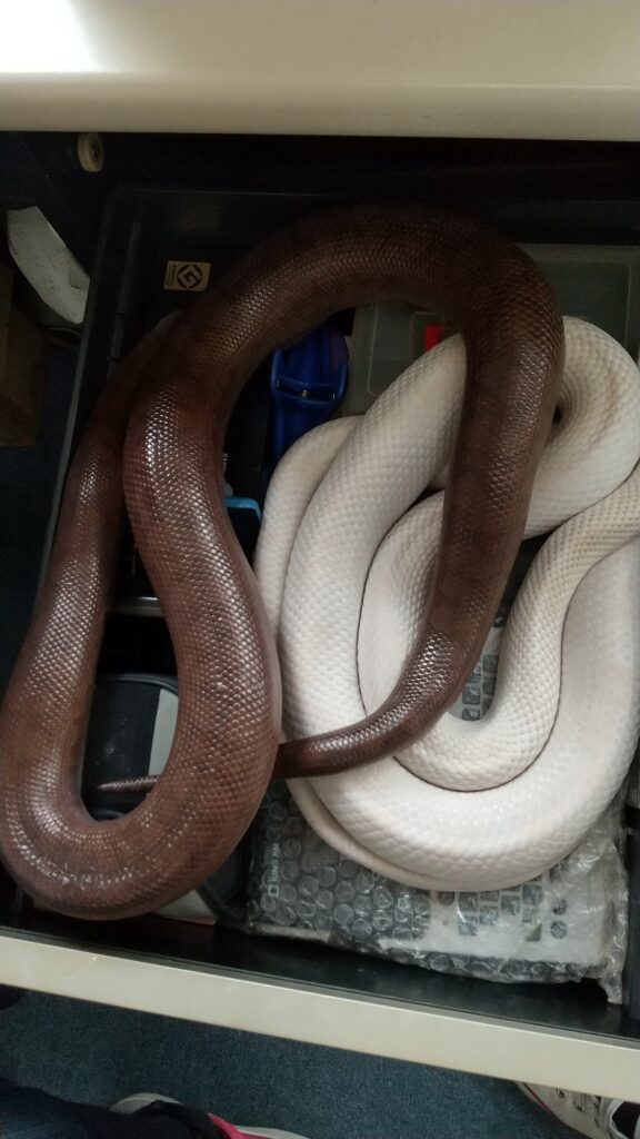 このお客さん、大のヘビ好き。で、事務所では数匹のヘビが!