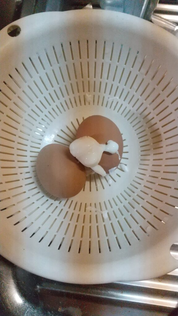沸騰したお湯の中に入れた瞬間にヒビが入ってしまったゆで卵。雑に入れ過ぎた...でも勿体ないから食べるけど。