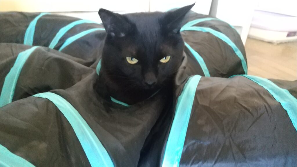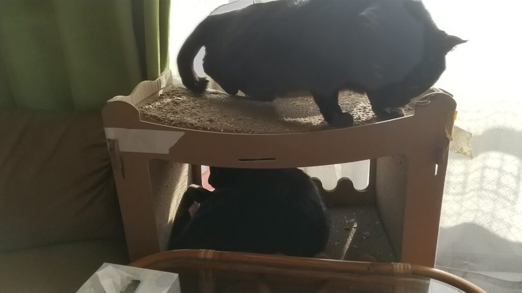 トンネル遊びが終わった後は、日が当たる窓辺の黒猫アパートでお昼寝準備