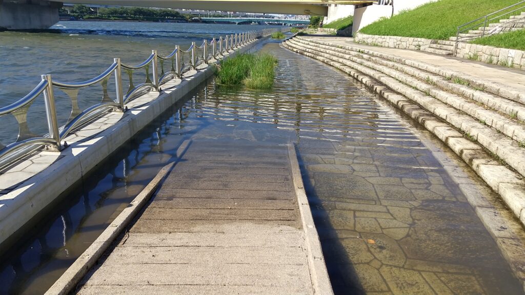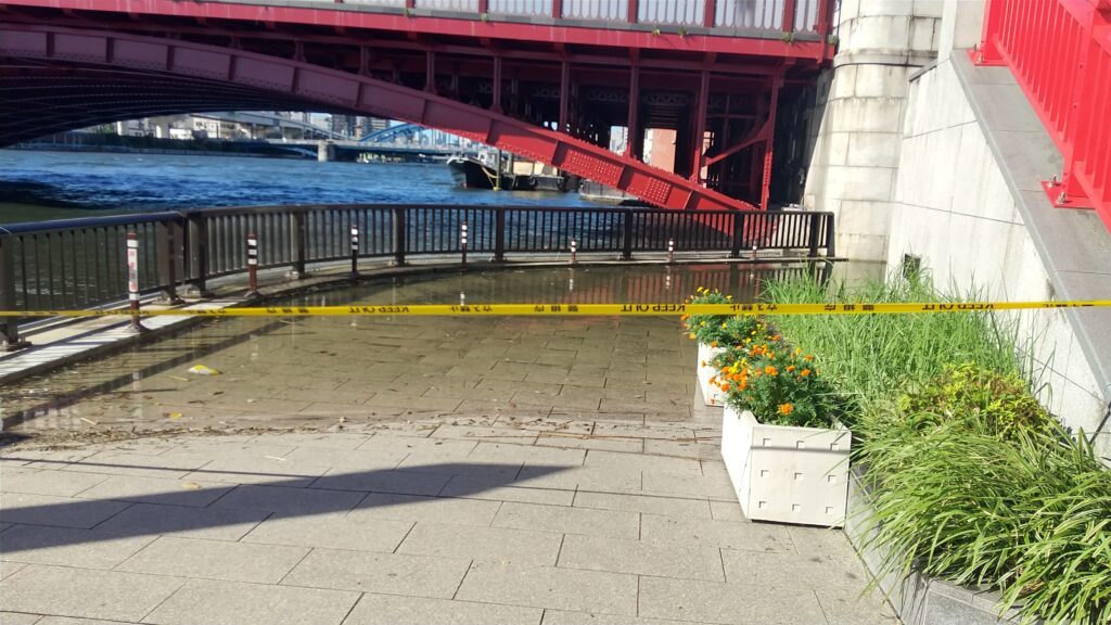 いつもは歩ける場所にも川の水が。水に浸かってる場所は黄色の立入禁止のテープ。
