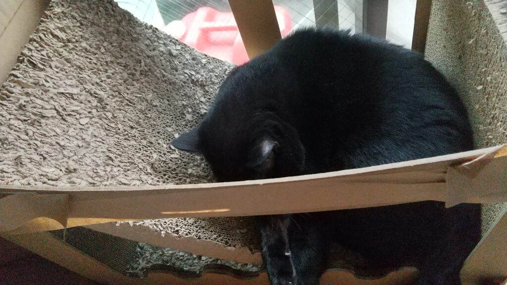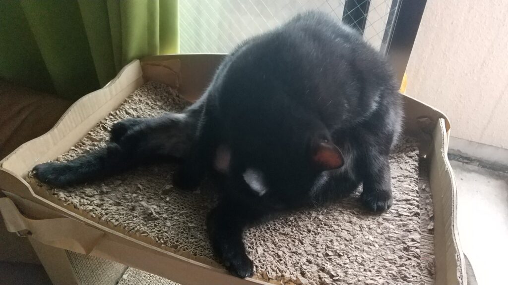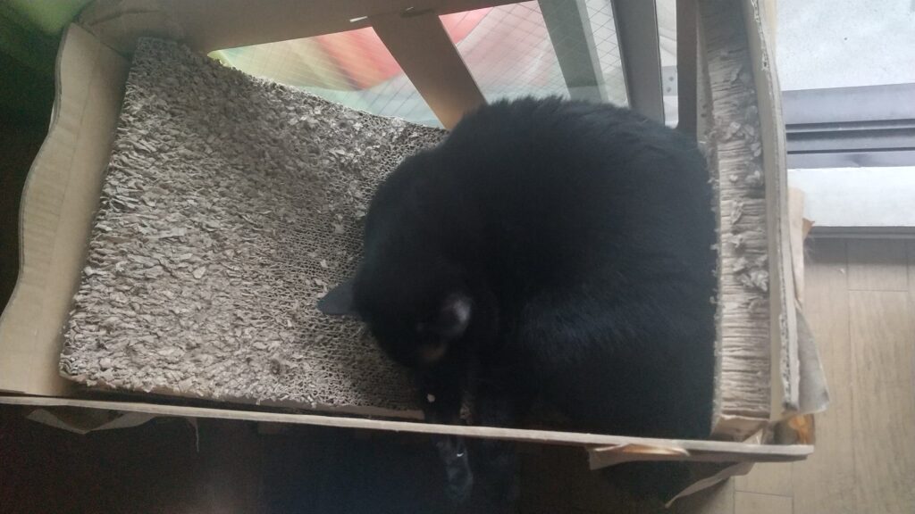 黒猫達のお気に入りのダンボールハウスの上部が欠落
