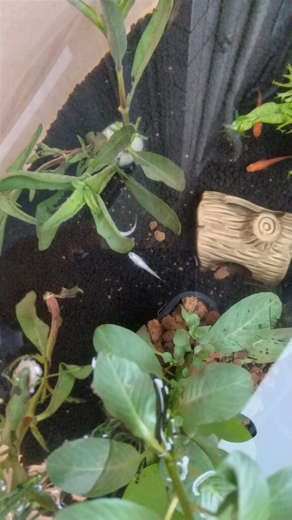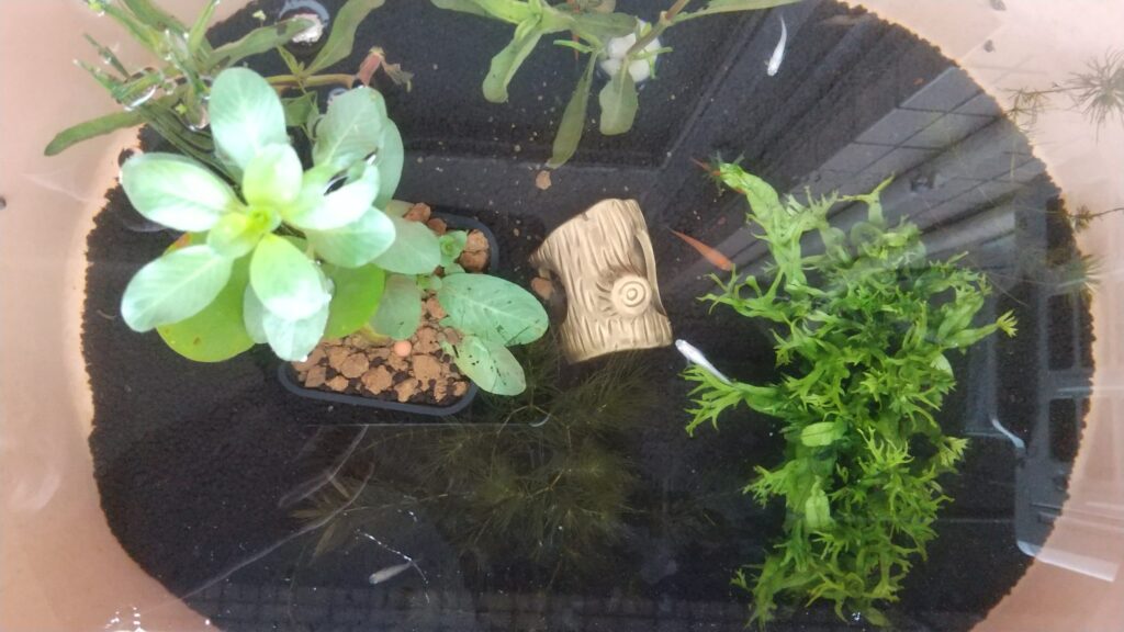 そして水を注入して数日放置。その後、メダカ投入(水槽で飼ってた一匹&購入したメダカ数匹。合わせて9匹)
