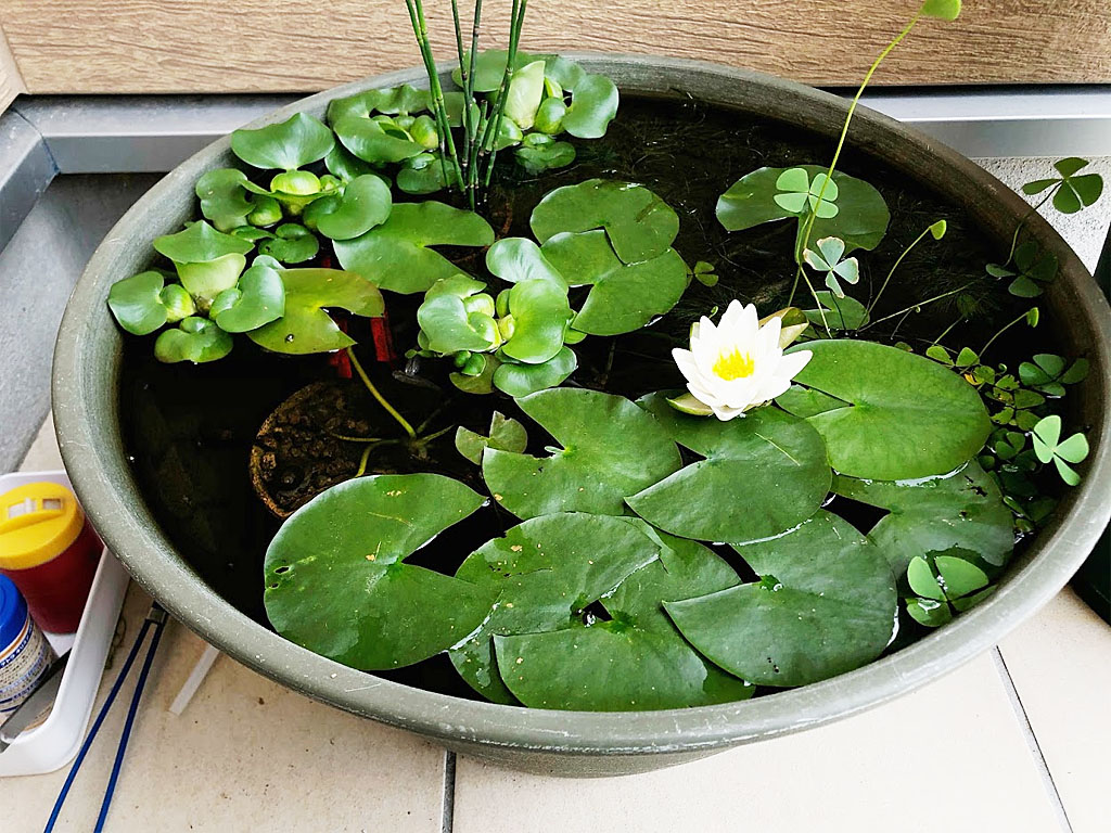 本来ならこんなビオトープが理想(この画像はネットより拝借。これは睡蓮鉢のビオトープ)