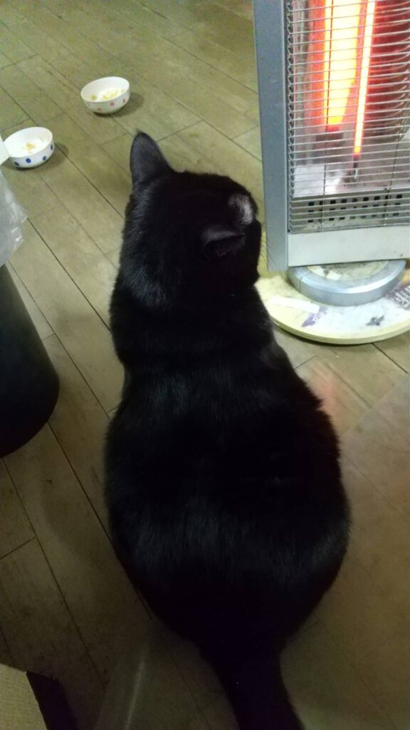 ヒーター前で暖をとるアラレ。