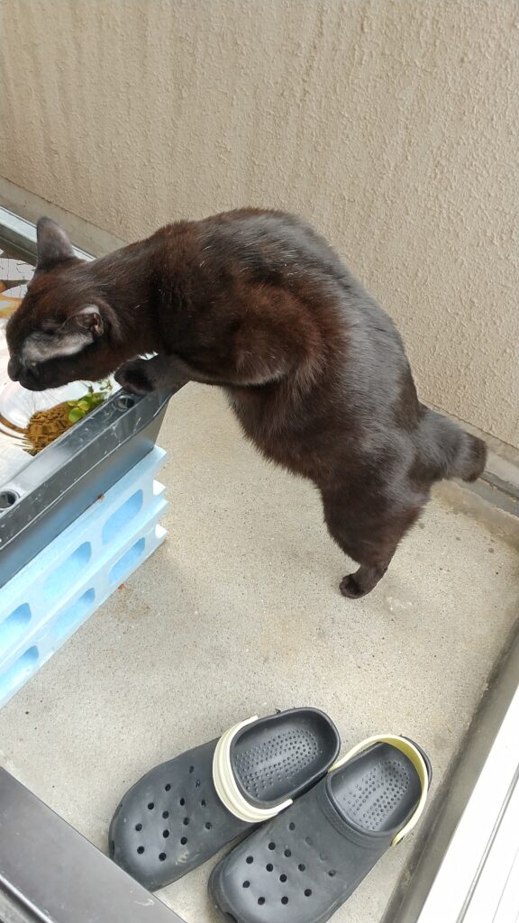 新しく立ちあげたメダカビオトープの水をこっそり飲むオカキ。