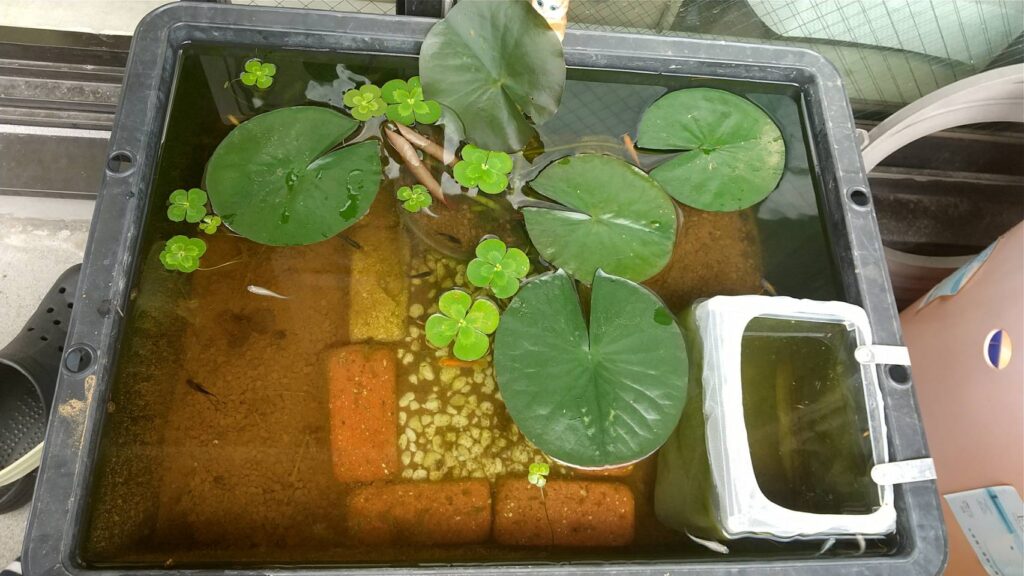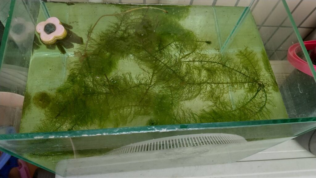 卵を破棄するのも気が引けるので、水中葉ごと別の水槽に放置。