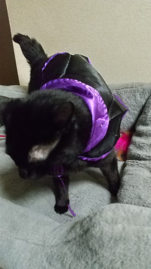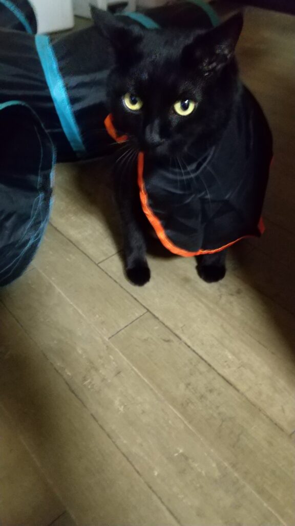 そんなことで、黒猫達に100円ショップで買ってきたハロウィン用のマントを