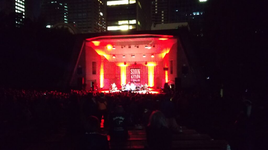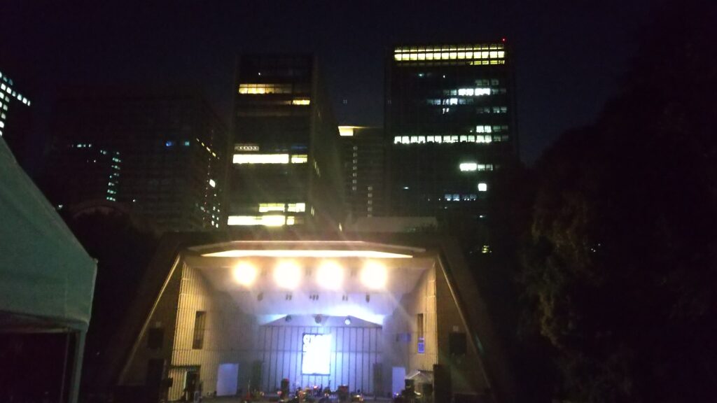 毎年思うけどステージの明かりと後ろのビルの明かりが何ともよい感じ。