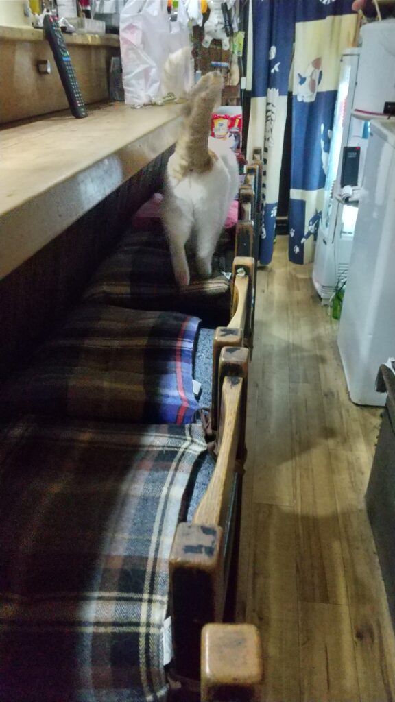 触られるに飽きたのかイスの上を歩いて移動するヒメちゃん。