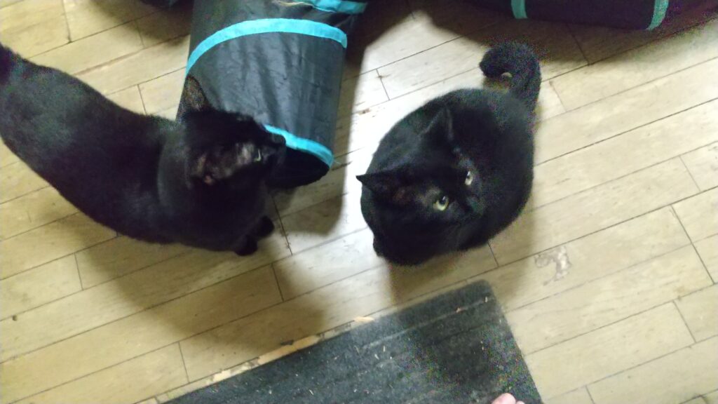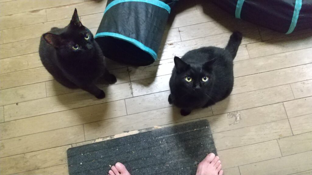 食事待ちの黒猫達。この時間はだけはやけに素直な連中...