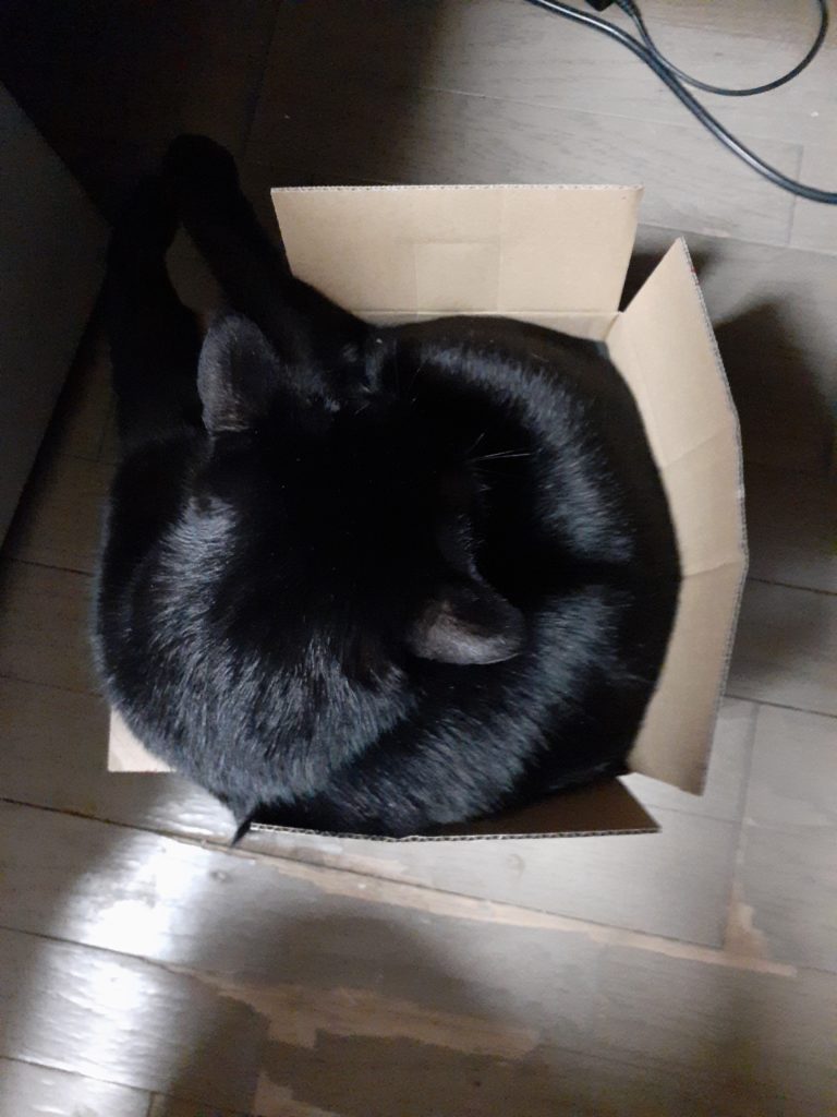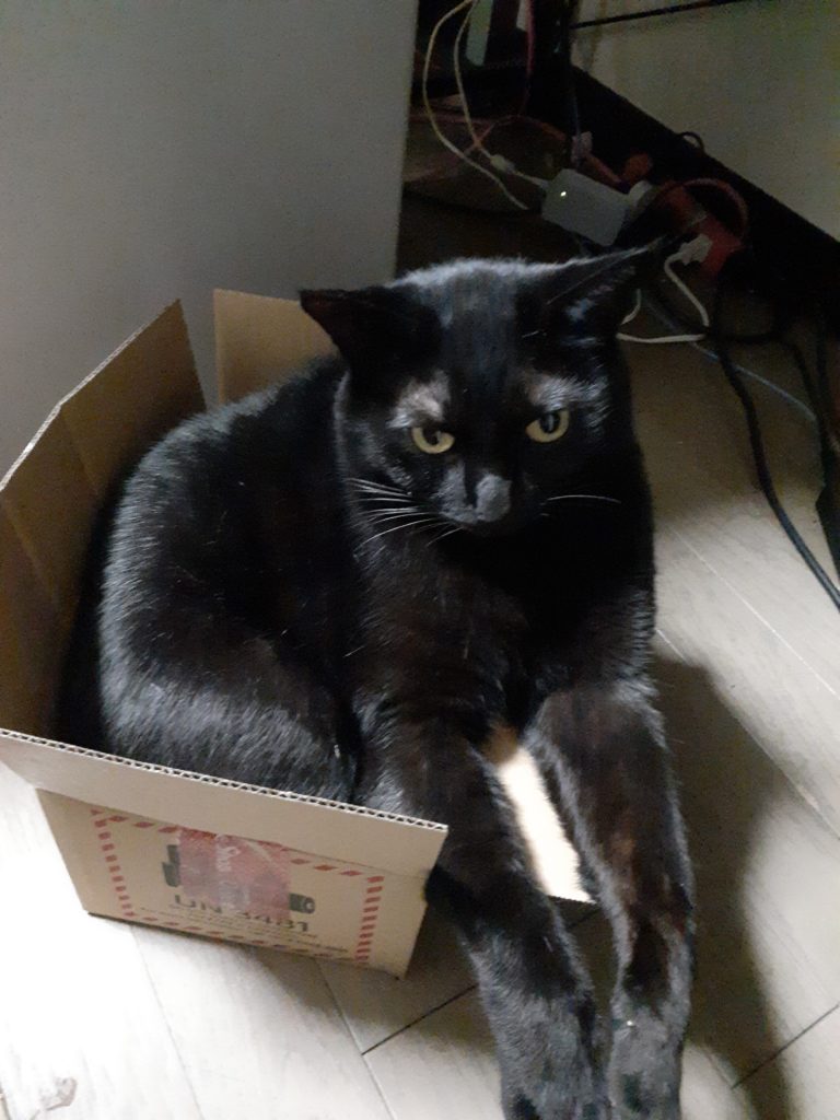 これは今日の画像。届いたスマホのダンボールに入るアラレ!