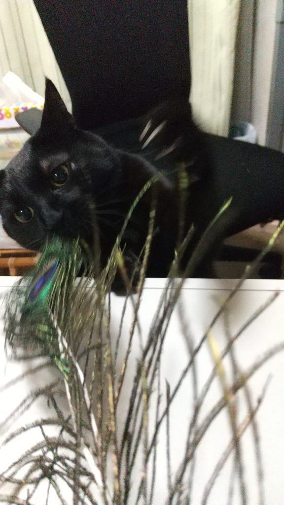 羽の猫ジャラシに強烈な左フックを浴びせるアラレ