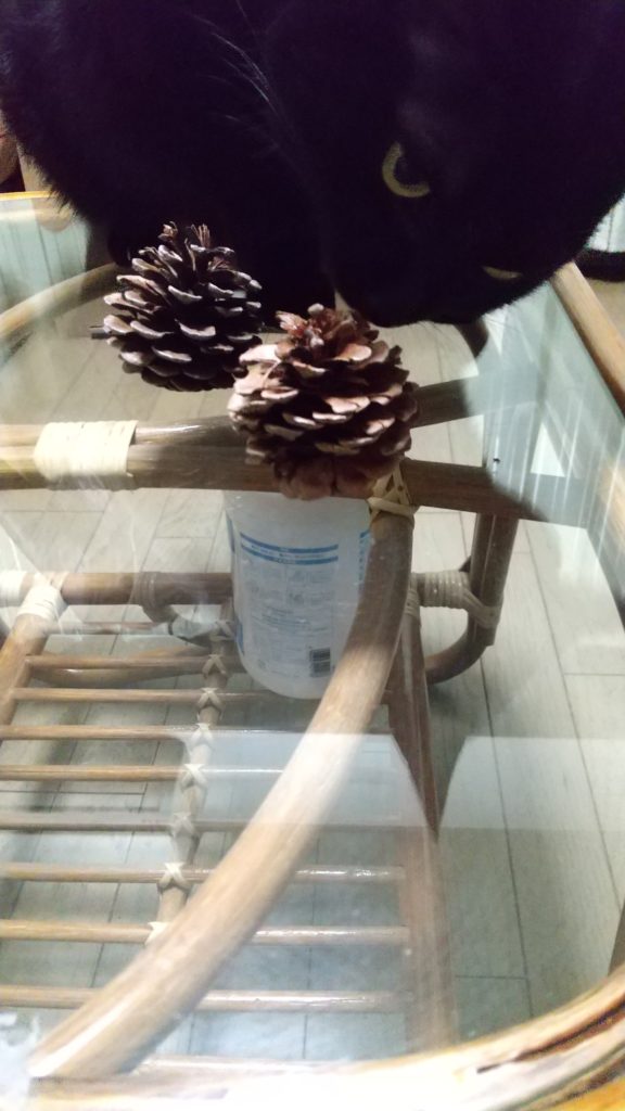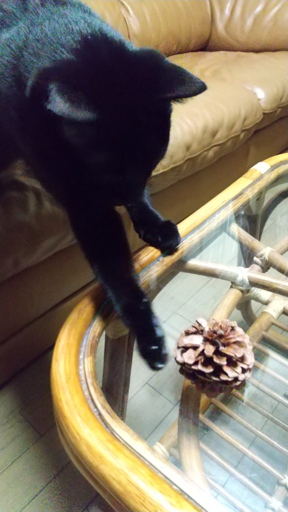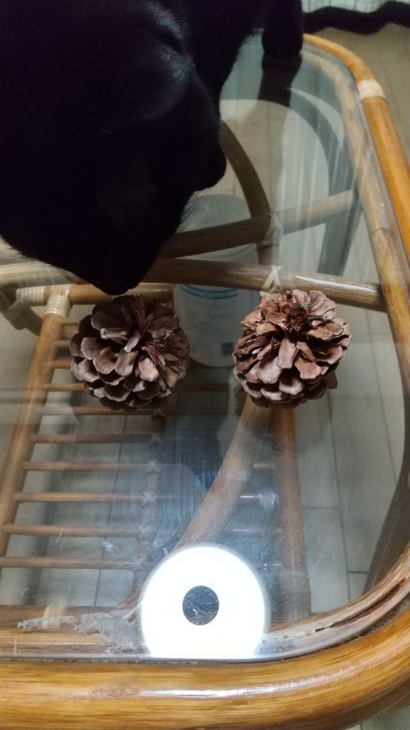 ゴルフ場で拾った松ぼっくりにどんな反応するか試してみた。