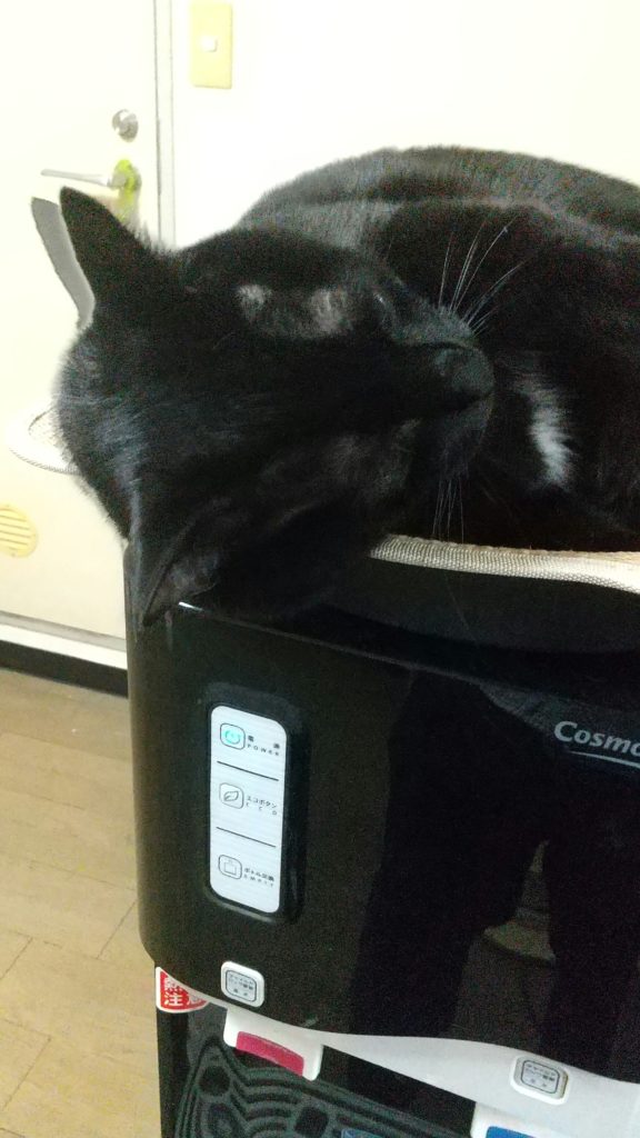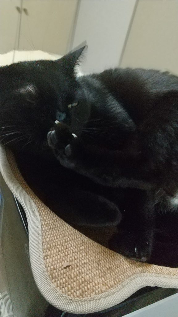 お気に入りの爪とぎトレイの上で寛ぐオカキ。