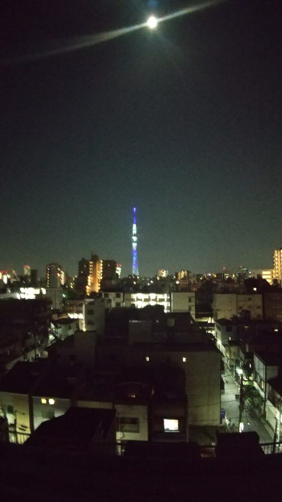 今日は満月だったのね。スカイツリーと満月がよい感じ!!